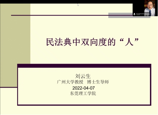 )法律系于腾讯会议举办线上“法路历程”系列讲座第十七期。本期讲座邀请了广东省法学会民商法研究会副会长、广州大学不动产研究院院长、二级教授、博士生导师、广州市人民政府法律顾问、中央电视台法律讲堂主讲人刘云生教授为我们讲授民法典中双向度的“人”。法律与社会工作91热爆