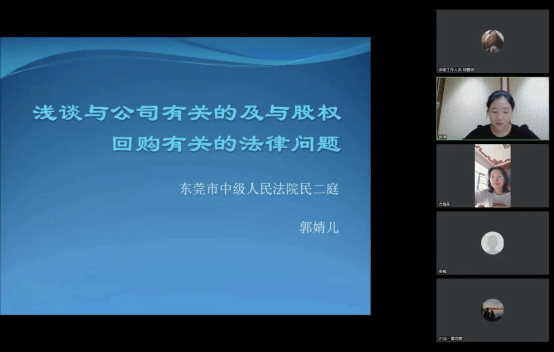 )法律系于腾讯会议举办第二十二期法路历程讲座:浅谈与公司有关的及与股权回购有关的法律问题讲座。本次讲座邀请了东莞中院四级高级法官、民二庭负责人郭婧儿法官担任主讲人。本次讲座由法律系副主任吉海荣主持。