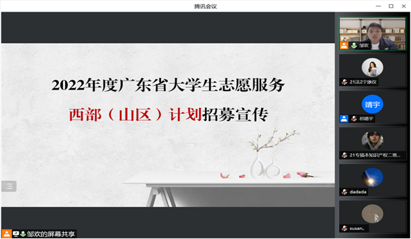 )于4月4日晚19:30在腾讯会议开展志愿服务西部(山区)计划招募的线上宣讲会,辅导员邹欢邀请西部(山区)计划志愿者祁靖宇师兄,分享他在基层工作的经历。