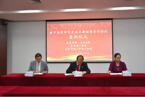 郑玉敏院长、沈亚萍副院长、法律系罗兆婧主任以及东莞市破产管理人协会刘开坛会长、何少红副会长、崔路燕副会长等出席签约仪式。