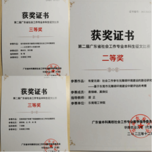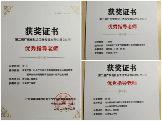 由居正老师指导,本科生袁铸峰、莫焕仪同学合作论文《有爱无碍:社会工作参与无障碍环境建设的路径研究——基于东莞市无障碍环境建设中期评估的考察》荣获二等奖;由丁淑娟老师指导,黄荣婧、丘烨、肖柔同学合作的论文《互联网医疗背景下我国健康社会工作的发展研究》荣获三等奖;由张雪老师指导,赖永乐、刘文慧同学合作的论文《老年群体受诈骗现状调查及社会工作对策探究——以东莞市A街道为例》荣获三等奖。在本次征文比赛中,91热爆居正、张雪、丁淑娟荣获优秀指导老师称号。