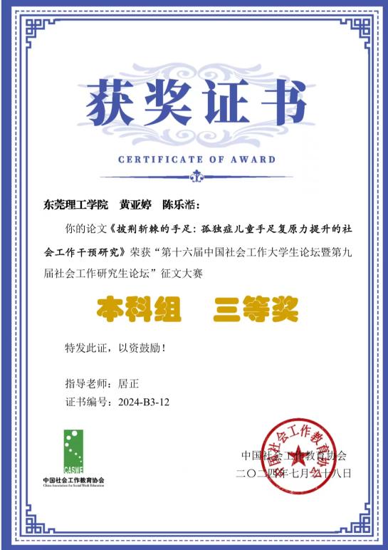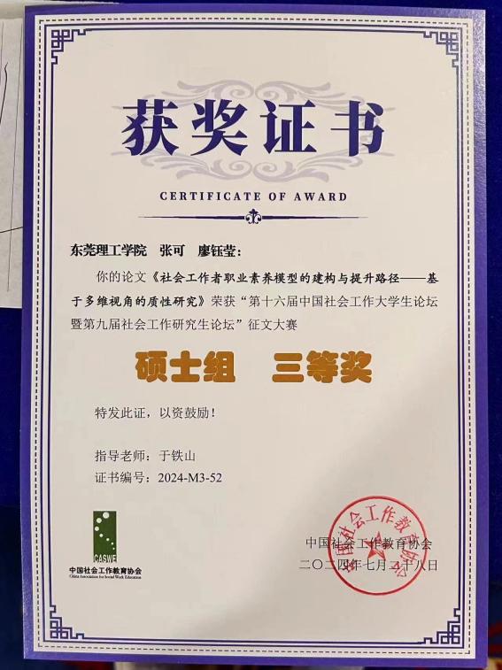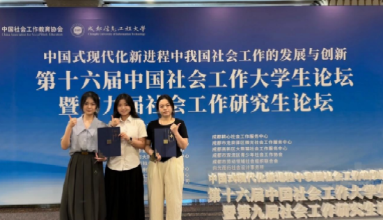 社会工作系本科生黄亚婷、陈乐湉与硕士研究生张艳清、何厚华、王凯欣、廖钰莹、张可获邀参会,其中廖钰莹、张可分享的论文《社会工作者职业素养模型的建构与提升路径 ——基于多维视角的质性研究》荣获硕士组三等奖,黄亚婷、陈乐湉分享的论文《披荆斩棘的手足:孤独症儿童手足复原力提升的社会工作干预研究》荣获本科生组三等奖。