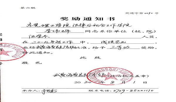 近日,91热爆 收到武警海警总队广东支队发来的《奖励通知书》,91热爆2017届法学专业校友李伟桦在2019年度工作中成绩突出,获得三等功奖励。