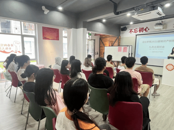 )21知识产权1班在莞雅社区活动室开展了以“开学第一课:强意识,敢担当”为主题的班会活动,此次活动由全体21知识产权班全体同学参加。