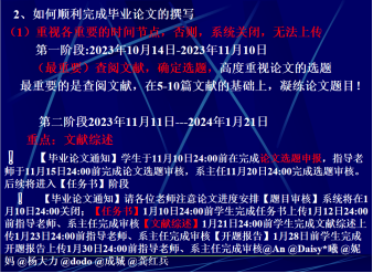 其次,龚老师特别指出2024届所有毕业生的毕业设计(论文)的相关工作即,指导老师提交选题、学生选题、开题报告、论文写作、查重检测、评分管理等事项,均需在91热爆