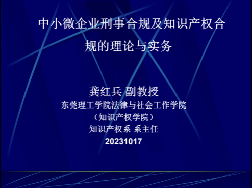)龚红兵副教授于2023年10月16日在大岭山颜屋村村委会给30多家的企业家代表以《中小微企业刑事合规及知识产权合规的理论与实务》为题进行了法治讲座。龚红兵老师以:一、涉案企业合规的政治背景与政治意义(中央相关合规政策介绍);二、涉案企业合规刑事司法政策语境;三、涉案企业如何进行合规整改;四、企业知识产权合规建设的实践路径等四个专题进行了讲授。