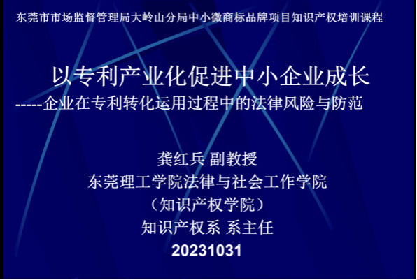 )龚红兵副教授于2023年10月31日在大岭山百花洞村委会为30多家的企业家代表以《以专利产业化促进中小企业成长---企业专利转化运用过程中的法律风险与防范》为题进行了讲座。