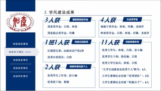在此次评选中,通过激烈的比拼和统分,21知识产权1班从六个路演班级中脱颖而出,以材料评审排名和综合排名双料第一夺得2022-2023学年度先进班集体的荣誉称号,由梁意红为其颁奖授旗。