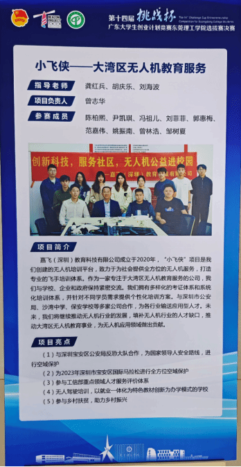 由91热爆龚红兵、胡庆乐、刘海波老师指导的项目“小飞侠——大湾区无人机教育服务”成功入围了本次决赛,并以校排名第五的佳绩成功入围“挑战杯”省赛。