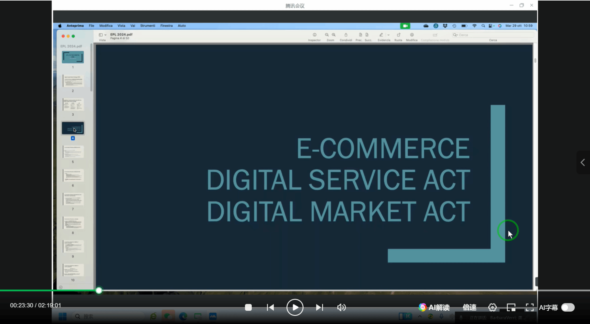芭芭拉•威丽(Barbara Verri)教授通过对数字单一市场策略(2015)、数字单一市场策略实施前后的立法措施、电子商务 数字服务法案 数字市场法案、电子商务指令、电子商务指令透明度和信息要求、数字服务、DSA-中介服务提供者的赔偿责任、DSA-尽职调查义务、数字市场法(DMA)这些政策和法律法规的解读,为我们讲述了在欧盟背景下载数字化时代下知识相关知识产权的一些政策,让同学们对欧盟的知识产权结构有了初步的了解。