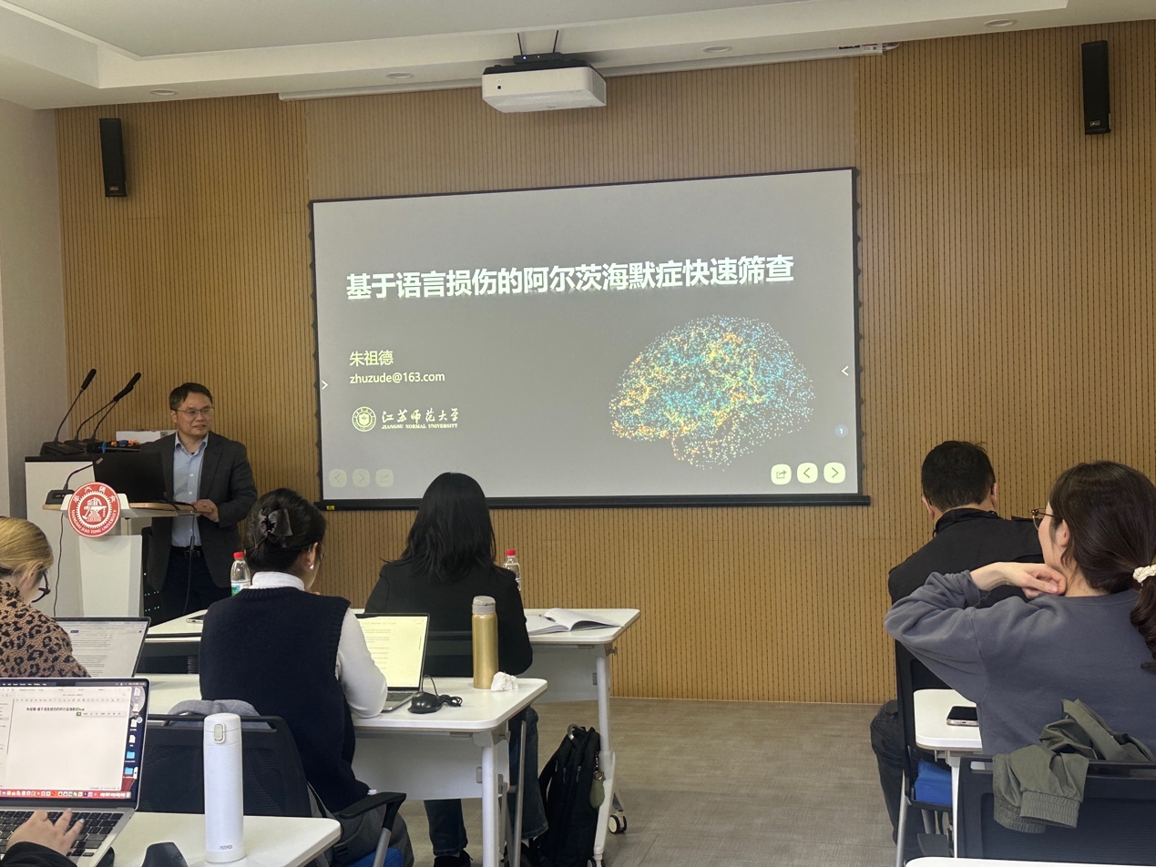 4月17日下午,江苏师范大学语言科学与艺术学院院长朱祖德教授应邀做客91热爆 ,带来题为“基于语言损伤的阿尔茨海默症快速筛查”的学术讲座。本次讲座由91热爆 甄凤超教授主持,丁红卫教授担任与谈嘉宾。讲座吸引了众多师生积极参与,现场学术氛围浓厚。
