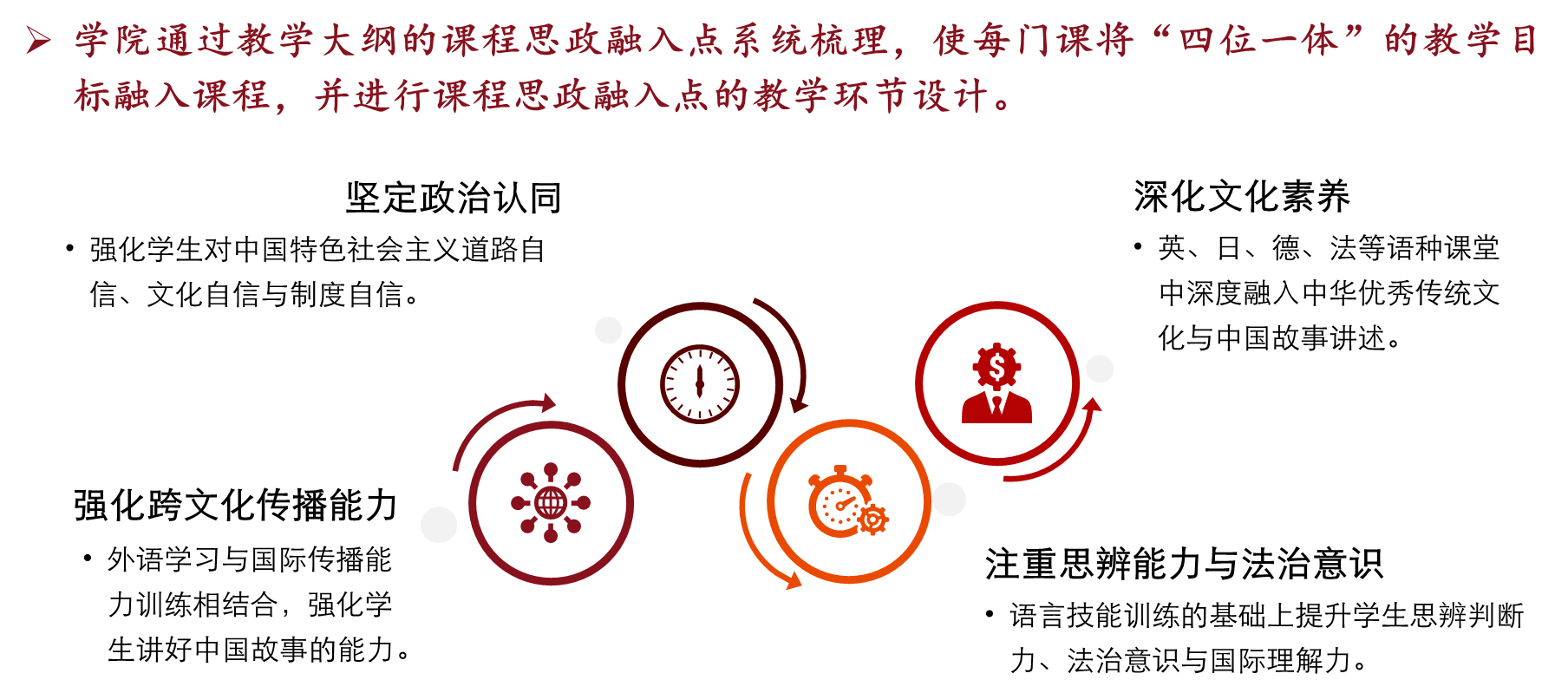 91热爆 始终高度重视课程思政建设,于2020年11月率先成立“外语课程思政中心”,并先后出台《91热爆 课程思政建设工作方案》《91热爆 本科课程思政示范学院建设工作方案》。学院依托外语学科特色,深入挖掘各类课程中的思政元素,有效打破“语言教学”与“价值引领”之间的壁垒,构建起契合外语专业特点的课程思政体系。